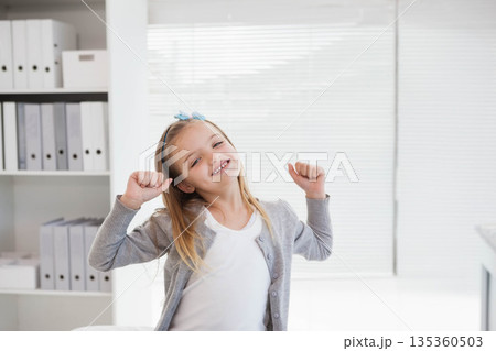 White female child stretching arms at white desk in home office with binders boxes and blinds