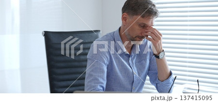 Man holding temples with fingers while working at desk in home office with laptop, plant, blinds