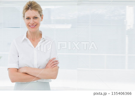 Female professional standing confidently in office under horizontal blinds wearing white blouse