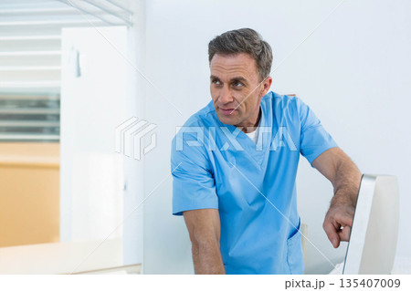 Senior male wearing scrubs leaning on desk in clinic examining monitor with blinds, copy space