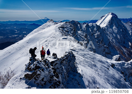 厳冬の八ヶ岳連峰・横岳稜線を行く登山者と富士山・赤岳の眺め