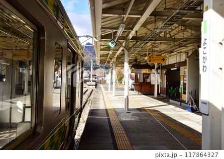 群馬県安中市 信越本線横川駅プラットホームと停車車輛と峠の釜めしおぎのや売店