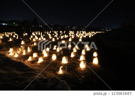(秋田の風物詩・冬の夜景) 蛇の崎河原のミニかまくら<横手の雪まつり>