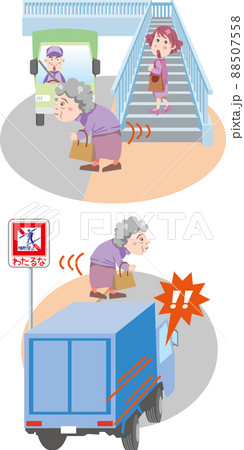 交通安全<トラックドライバーと高齢者・歩道橋を避けるなどして横断禁止の道路を渡る>