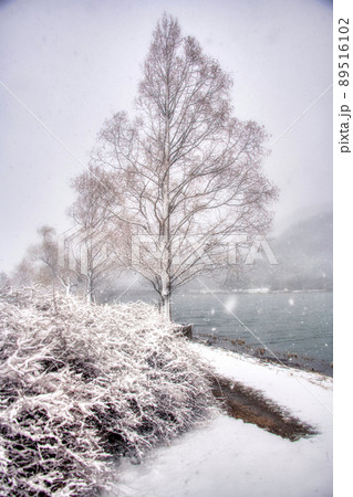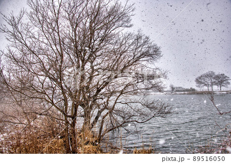 雪、吹雪、自然、自然風景、風景、湖、湖畔、冬、寒い、冷たい、横殴りの雪、沢山、白、大雪、雪景色、冬景
