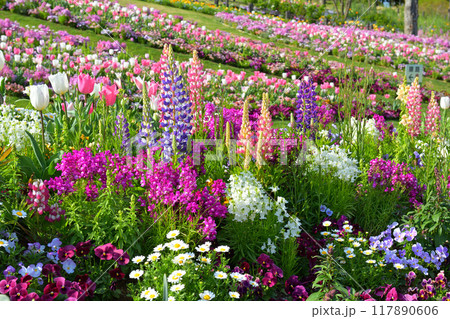 穀雨の日の神奈川県横浜市旭区上白根町の里山ガーデンの花壇の花