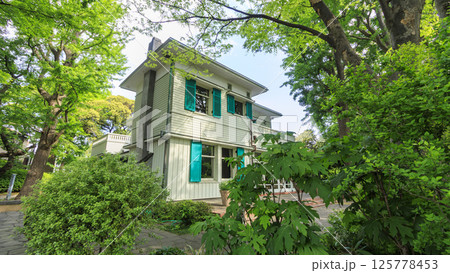 横浜 山手資料館の庭に続く庭園 新緑バック 2021年5月撮影