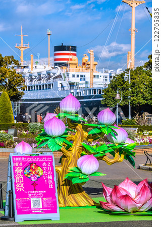 日本の横浜都市景観2月春節祭。山下公園・中央広場などを望む。奥は氷川丸=令和7年2月7日