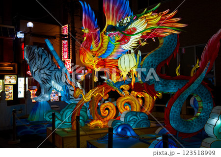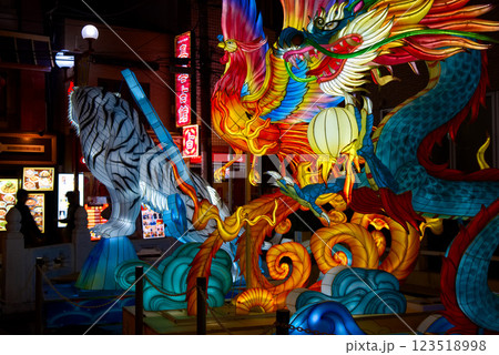 日本の横浜都市景観 希望の光…中華街大通り香港路前のドラゴンランタン(2024春節燈花)=28日
