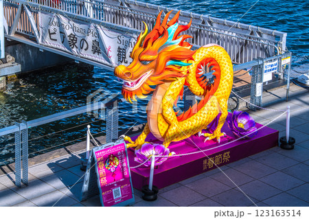日本の横浜都市景観2月春節祭。ピア象の鼻・フェリー桟橋前などを望む=令和7年2月13日
