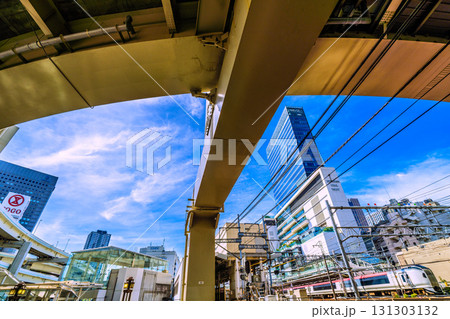 日本の横浜都市景観 相鉄線横浜駅や出発した電車などを望む