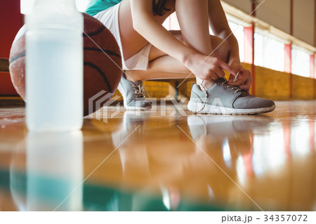 Woman tying shoelace while crouching on floor