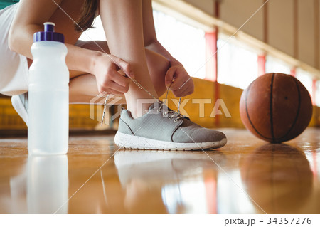 Close up of woman tying shoelace