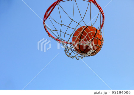 A basketball in a net against the sky. Sports, street game. The ball is in the ring.