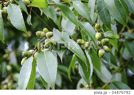 自然 植物 アラカシ、茶色く色づき始めた鈴なりのドングリ