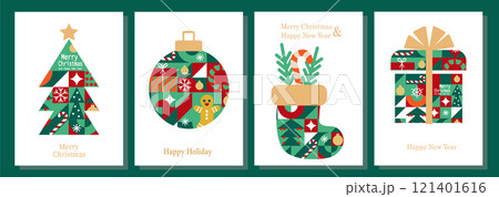 Christmas card templates. Christmas icons and elements in abstract modern geometric style. Set of winter cards and posters. Santa, Christmas ball, Christmas tree and Christmas sock in Bauhaus style.