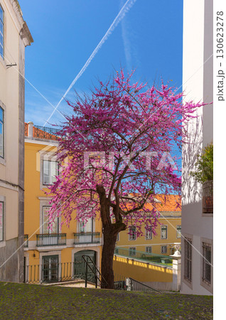 Beautiful garden with flowered cherry trees, cypresses and olive trees