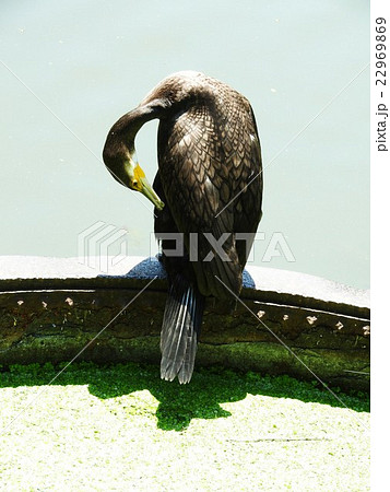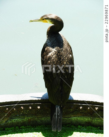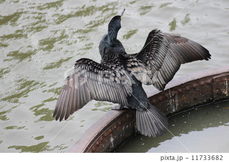 日比谷公園の濠で羽根を乾かすカワウ。