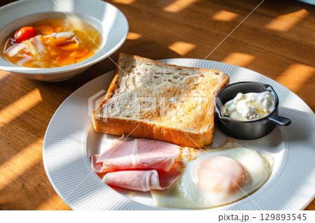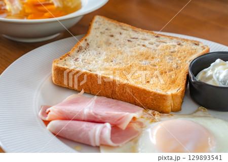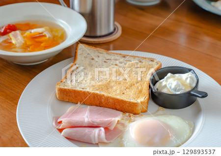 トーストや目玉焼き、ハムとヨーグルトを添えた洋風朝食セット