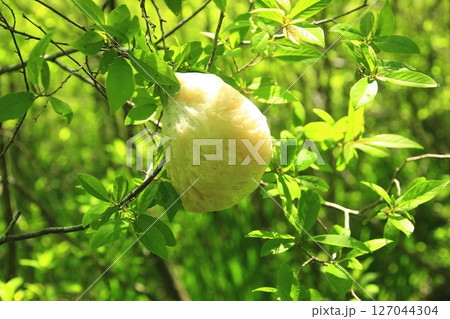 初夏、高原の池の上の木に産み付けられた、モリアオガエルの卵