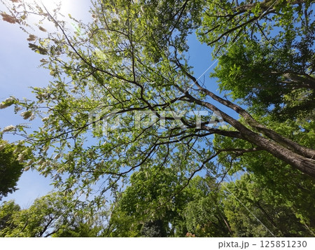 新緑の木々を見上げる 新緑と青空のある風景 青空に映える新緑 新緑の季節の樹木を見上げる 光を浴びて