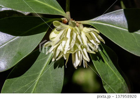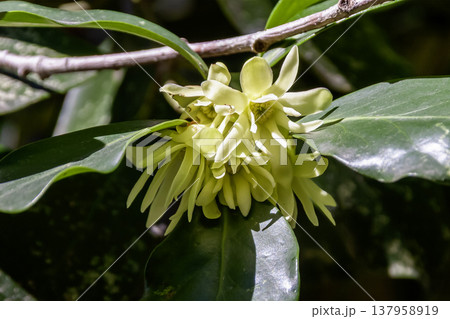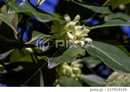 多くの黄白色の花被片が咲くシキミ【マツブサ科】