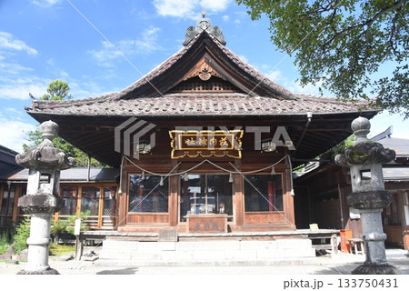 木造社殿の伝統的な日本建築と石灯籠のある神社風景