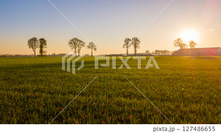 Aerial view on a dramatic and colorful sunrise or sunset sky over a grassy green farmfield shot from