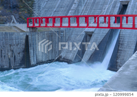 群馬県 八ッ場ダムの放水/観光客がいる赤い八ッ場もみじ橋