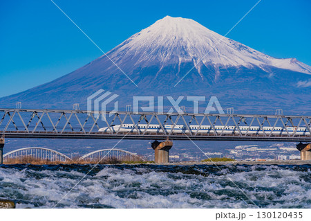 【静岡県】日本三大急流の富士川を渡る新幹線と富士山