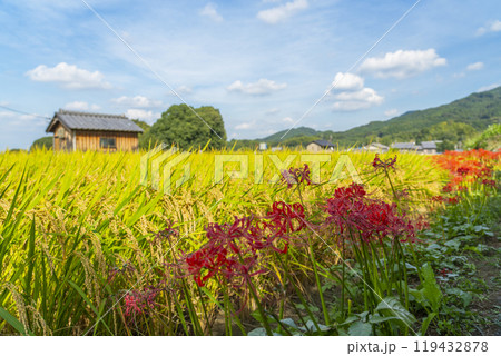 橘寺へ至る参道 稲穂が実りあぜ道に彼岸花が咲き誇る(奈良県明日香村)