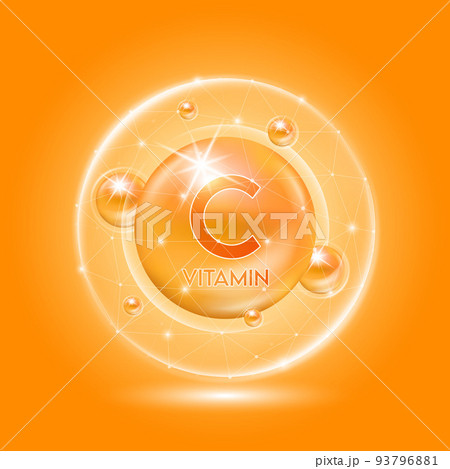 Vitamin C Orange shining pill capsule. Vitamin complex with Chemical formula. Meds for health ads. Beauty treatment nutrition skin care design. Vector illustration.