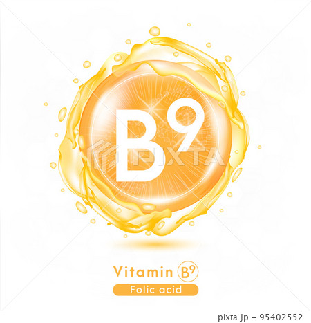 Vitamin B9 Orange shining pill capsule. Vitamin complex with Chemical formula.