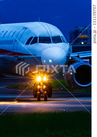 Modern passenger airplane on the airport apron against the backdrop of a picturesque sunset