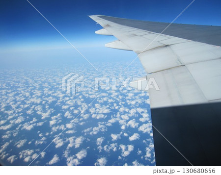 旅立ちの飛行機、左翼の窓から見る翼の奥に広がる白い雲海 広告・観光パンフレット、デザイン素材