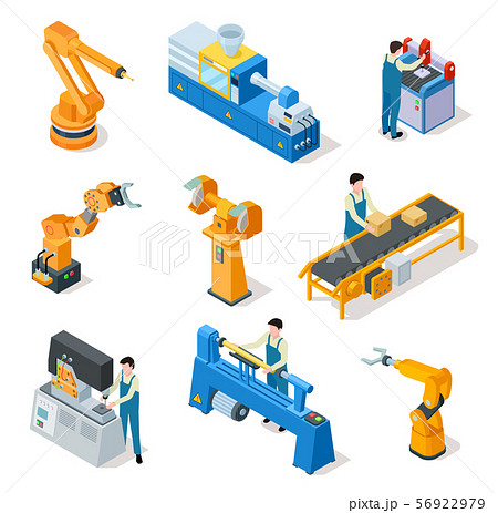 Industrial robots. Isometric machines, assembly line elemets and robotic arms with workers. 3d