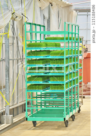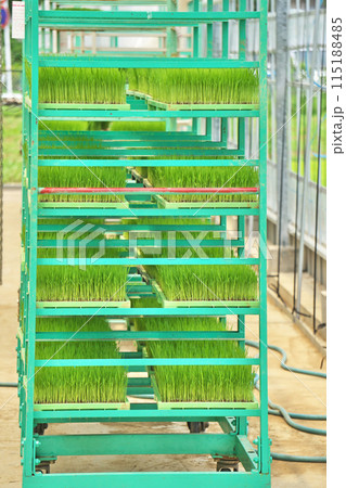 田植えを待つ育苗箱のコメの苗(春、五月)