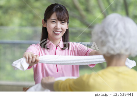 シニア女性と一緒にタオル体操をする介護スタッフ