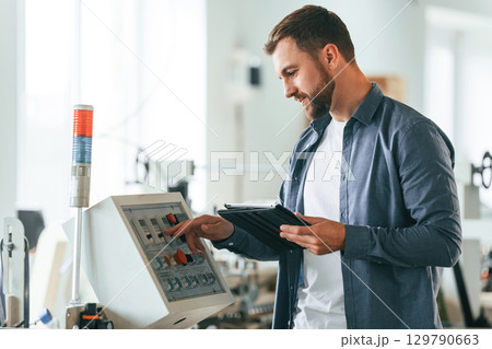 Operating the machine. Handsome man is working at the factory of creating eco boxes