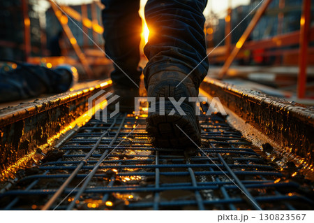 A construction worker is wearing leather safety shoe, standing at construction working site. Generative Ai