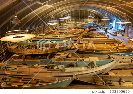 三重県鳥羽市 海の博物館の収蔵庫である船の棟の木造船がいっぱいの内部