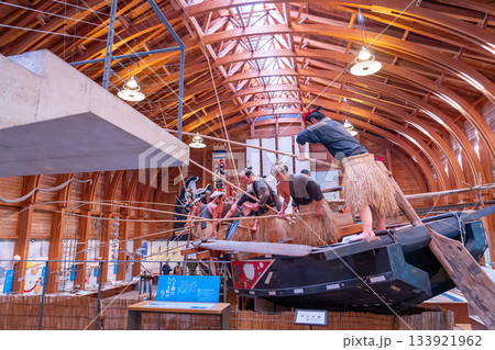 三重県鳥羽市 海の博物館の内部で展示されているカツオ船