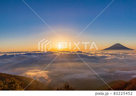 (山梨県)櫛形山の紅葉 大雲海に浮かぶ富士山 日の出