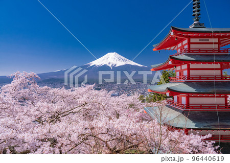 《山梨県》富士山と五重塔と満開の桜・春の新倉山浅間公園