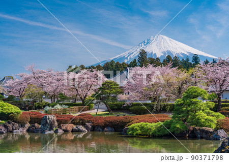 (静岡県)桜満開の大石寺庭園と富士山