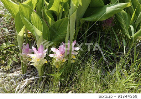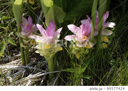 初夏の日差しを浴びて咲いているピンクのウコンの花