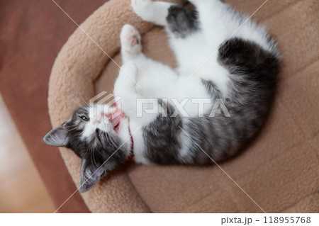 Two white and black domestic kittens sleeping, lying on white light blanket on sofa. Sleep cat. Concept of adorable pets.