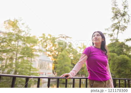 Peruvian student enjoys the view of the lake and the monument to alfonso xii in retiro park, madrid