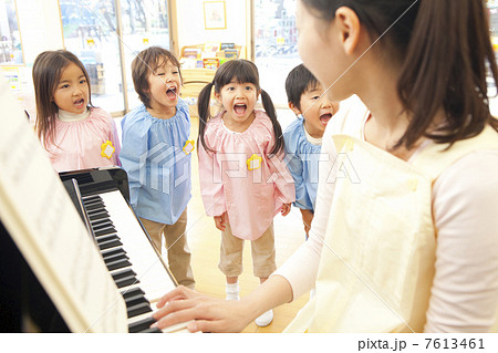 幼稚園教諭のピアノに合わせて歌う幼稚園児