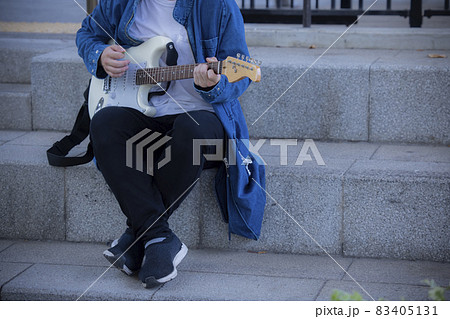 桜の花に桜の花に埋もれてギターを弾き語る女子高校生